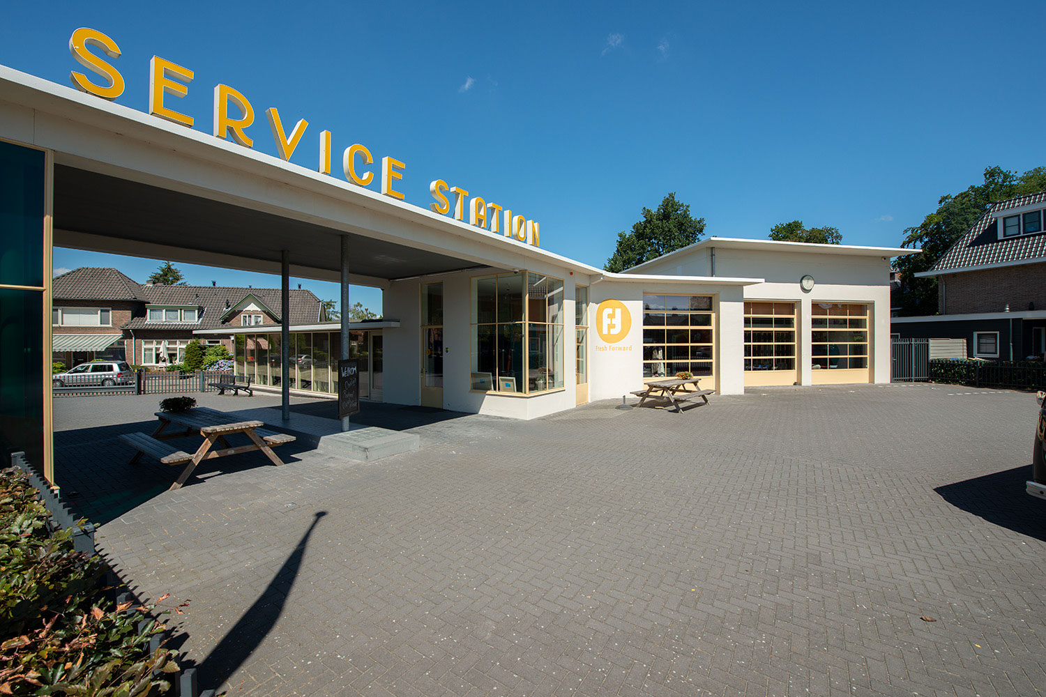 Na een lange periode van leegstand kocht vastgoedeigenaar Hanegraaf in 2010 het voormalige Servicestation en begon aan de uitdaging om er weer iets moois van te maken. Een grootscheepse verbouwing volgde waarbij de oude showroom helemaal teruggebracht is. Er kwam een grote kelder en aan de achterzijde is een flinke vleugel aangebouwd. Het resultaat is verbluffend. Zelfs de originele klok prijkt weer aan de gevel. Via een ondergrondse gang zijn de twee gebouwen nu met elkaar verbonden. Binnen is er verrassend veel ruimte door onder meer de ingenieus aangelegde vide in de oude werkplaats. In de voormalige wasstraat is een grote keuken geplaatst. Leuk detail: een muur is nog bekleed met de originele lichtgele tegeltjes. Het Servicestation (de naam prijkt weer fier op het dak) beschikt over meerdere werkruimtes. Het adviesbureau dat het pand huurt, heet er nu dagelijks gasten welkom om te brainstormen en te vergaderen. Het schoolbord buiten verraadt wie er die dag binnen zit; van NOS tot Heineken.